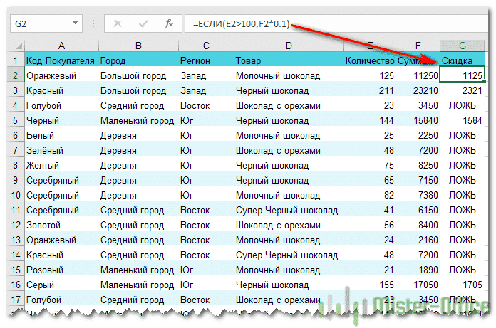 Мы вставляем функцию ИЛИ как условие в функцию ЕСЛИ. В нашем случае, если регион покупателя - Восток или Юг, отгрузка считается экспортной.