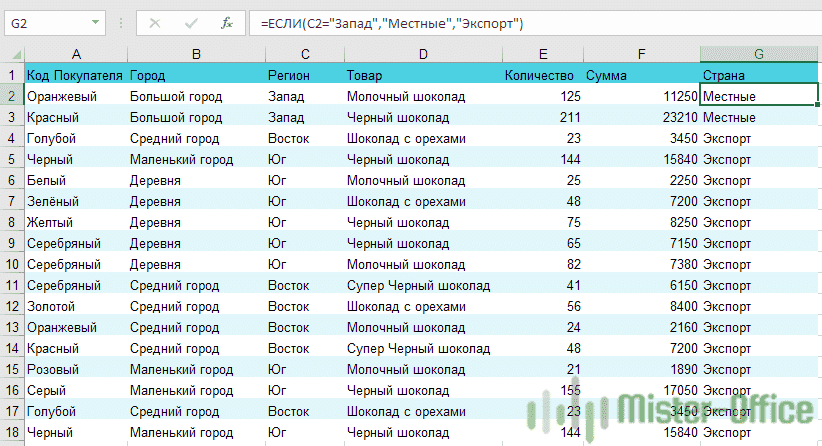 = IF (C2 = «Запад», «Местный», «Экспорт")