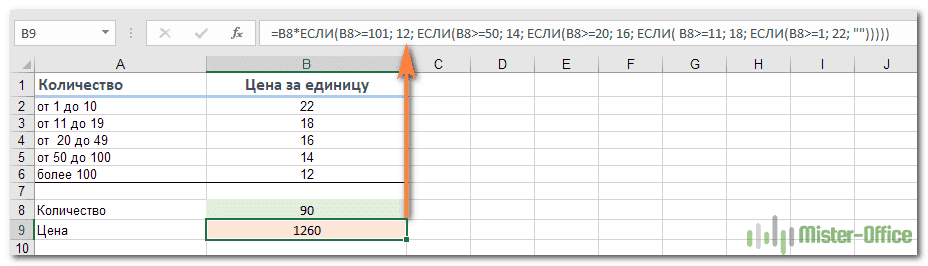 Вот еще одна типичная проблема: цена за единицу продукта меняется в зависимости от количества. Ваша цель - написать формулу, которая вычисляет цену для любого количества предметов, введенных в определенную ячейку. Другими словами, ваша формула должна проверять разные условия и выполнять разные вычисления в зависимости от диапазона суммы, к которой относится указанное количество товаров.