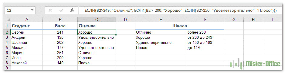 = ЕСЛИ (B2> 249; «Отлично»; ЕСЛИ (B2> = 200; «Хорошо»; ЕСЛИ (B2> 150; «Удовлетворительно»; «Плохо")))