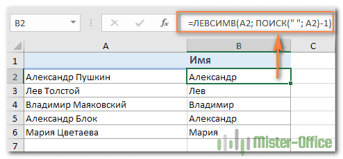 Предполагая, что полное имя находится в ячейке A2, позиция в пробеле возвращается по этой простой формуле: ПРОСМОТР(» «; A2)). А теперь вы вставляете это выражение СЛЕВА: