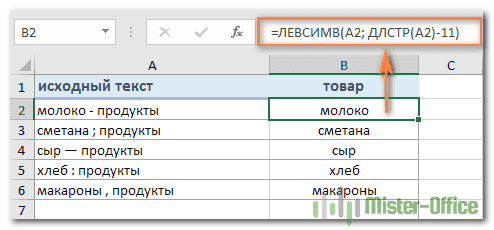 Как показано на скриншоте, формула успешно удаляет слово «товары» (8 букв, разделитель и 2 пробела) из текстовых значений в столбце А.