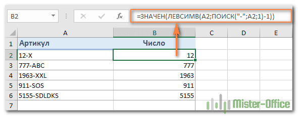Например, чтобы извлечь символы перед разделителем «-» из A2 и преобразовать результат в число, вы можете сделать следующее: