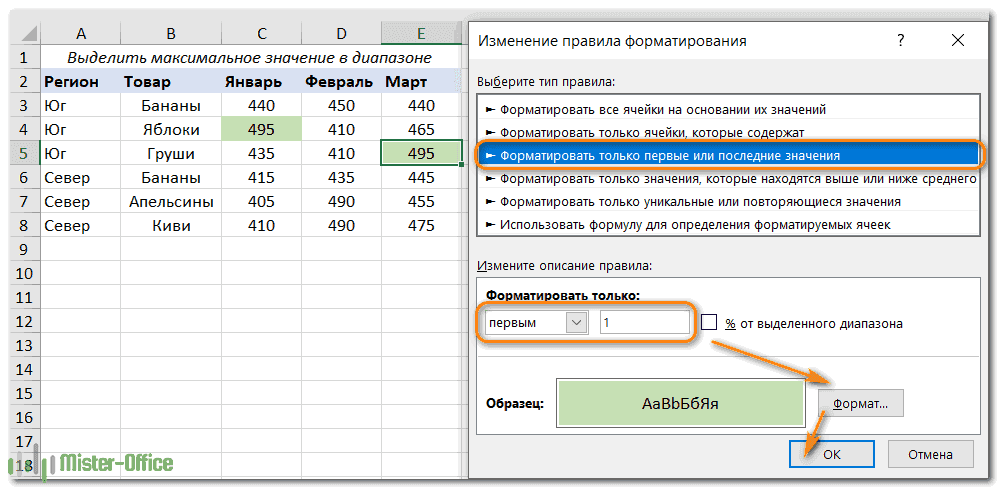 - В диалоговом окне «Новое правило формата» выберите «Форматировать только первое или последнее значение».