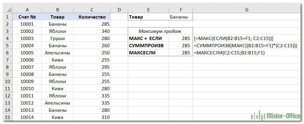 Если вы хотите получить максимальное значение при соблюдении некоторых условий, вы можете выбрать одну из нескольких формул ниже. Чтобы убедиться, что все они возвращают один и тот же результат, мы проверим их на одном и том же наборе данных.