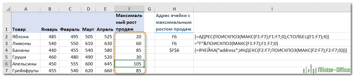 {=ЯЧЕЙКА("адрес", ИНДЕКС(F2:F7,ПОИСКПОЗ(МАКС(F2:F7),F2:F7,0)))}