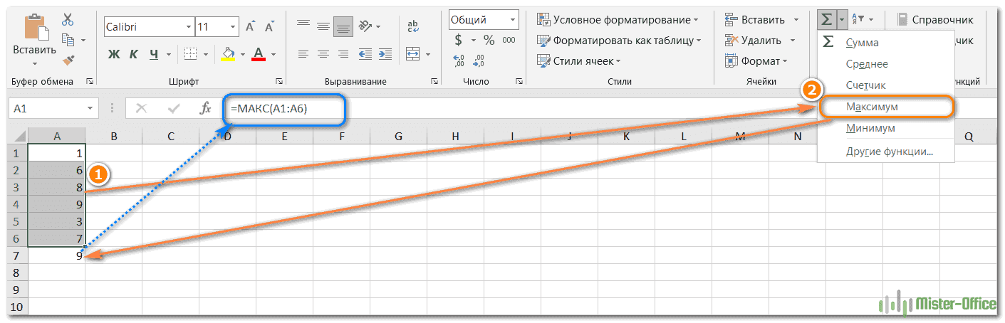 - На вкладке «Главная» в группе «Форматы» нажмите «Автосумма» и выберите «Максимум» в раскрывающемся списке.