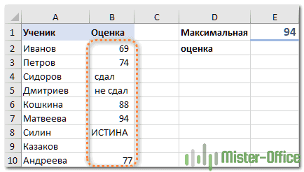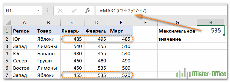 Найдите наибольшее значение в несмежных ячейках или диапазонах