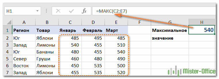 Чтобы извлечь наибольшее число из группы чисел, передайте эту группу функции MAX в качестве ссылки на диапазон. Диапазон может содержать любое количество строк и столбцов. Например, чтобы получить максимальное значение C2:E7, используйте эту простую формулу: