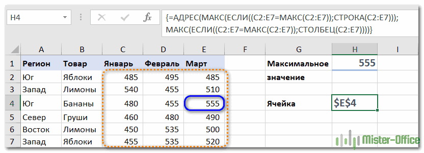 {=АДРЕС(МАКС(ЕСЛИ((C2:E7=МАКС(C2:E7)), СТРОКА(C2:E7))), МАКС(ЕСЛИ((C2:E7=МАКС(C2:E7))) , СТОЛБЦ (С2 :Е7))))}