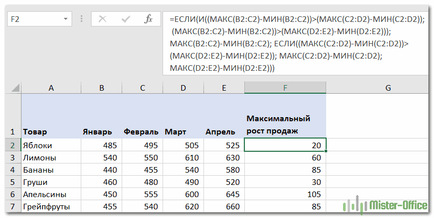 =ЕСЛИ(И((МАКС(B2:C2)-МИН(B2:C2))>(МАКС(C2:D2)-МИН(C2:D2)), (МАКС(B2:C2)-МИН(B2:C2))))>(МАКС(D2:E2)-МИН(D2:E2))), МАКС(B2:C2)-МИН(B2:C2), ЕСЛИ((МАКС(C2:D2)-МИН(C2:D2)))>(MAX(D2:E2)-MIN(D2:E2)), MAX(C2:D2)-MIN(C2:D2),MAX(D2:E2)-MIN(D2:E2)))
