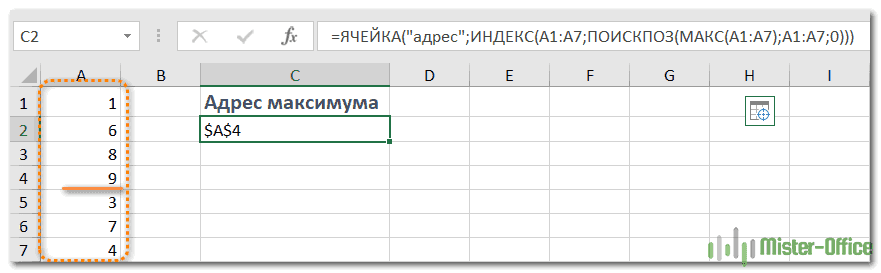 =ЯЧЕЙКА("адрес", ИНДЕКС(A1:A7,ПОИСКПОЗ(МАКС(A1:A7),A1:A7,0)))
