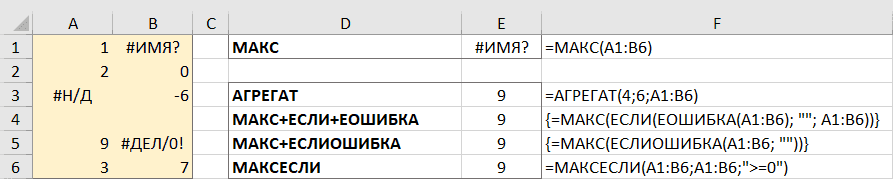=МАКС(ЕСЛИ.ОШИБКА(A1:B6; ""))