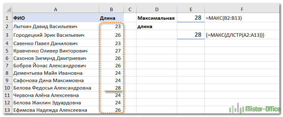 А затем применяем функцию MAX, чтобы узнать максимальную длину полного имени.
