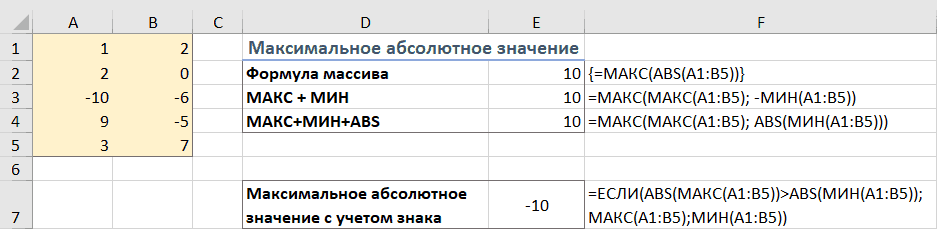 =ЕСЛИ(АБС(МАКС(A1:B5))>АБС(МИН(A1:B5)), МАКС(A1:B5),МИН(A1:B5))