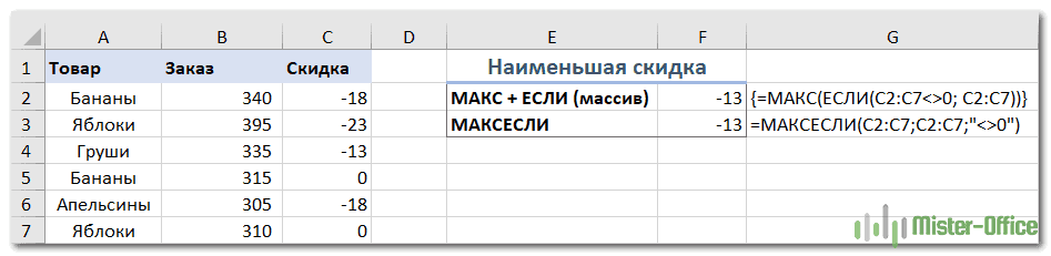 =МАКСЕСЛИ(C2:C7;C2:C7;"0")