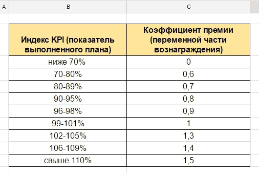 Например, если план выполнен менее чем на 70%, переменная часть вознаграждения может вообще не выплачиваться работнику.