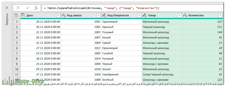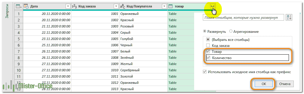 После выполнения описанных выше шагов редактор Power Query отобразит вашу первую таблицу (Порядок) с дополнительным столбцом. Она будет называться вашей второй таблицей (Product) и будет добавлена в конце. Значений пока нет, только слово "Таблица" во всех ячейках. Но не волнуйтесь, вы все сделали правильно, и мы скоро это исправим!