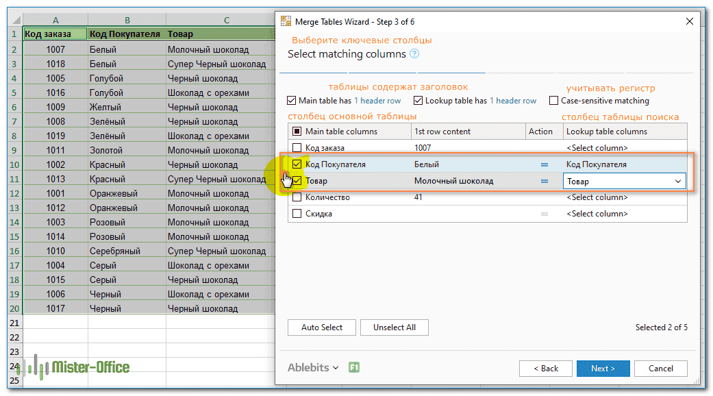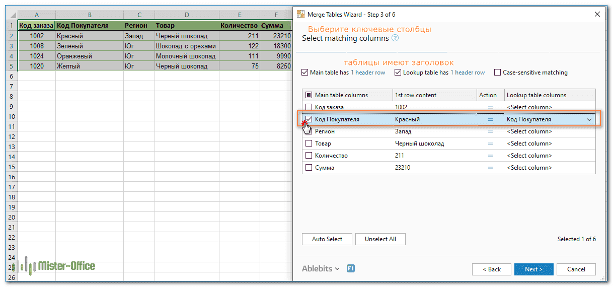 Эта операция нам уже знакома: выбираем ключевой столбец, в котором будем искать совпадения в обеих таблицах.