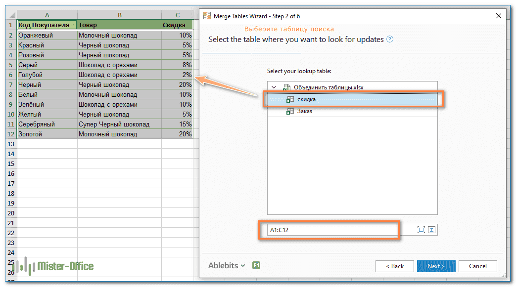 Предположим, у вас есть две таблицы на двух разных листах: основная содержит коды заказов и клиентов (то есть кому вы продаете), а вторая содержит заказы и товары (то есть то, что вы продаете). Вы хотите объединить их, сопоставив данные в столбце Код заказа: