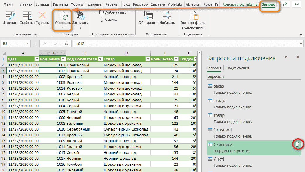 Кроме того, вы можете нажать кнопку «Обновить все» на вкладке «Данные» или кнопку «Обновить» в запросе (эта вкладка активируется после выбора любой ячейки в объединенной таблице).