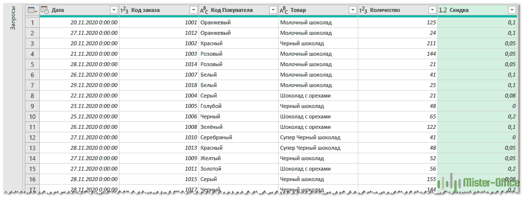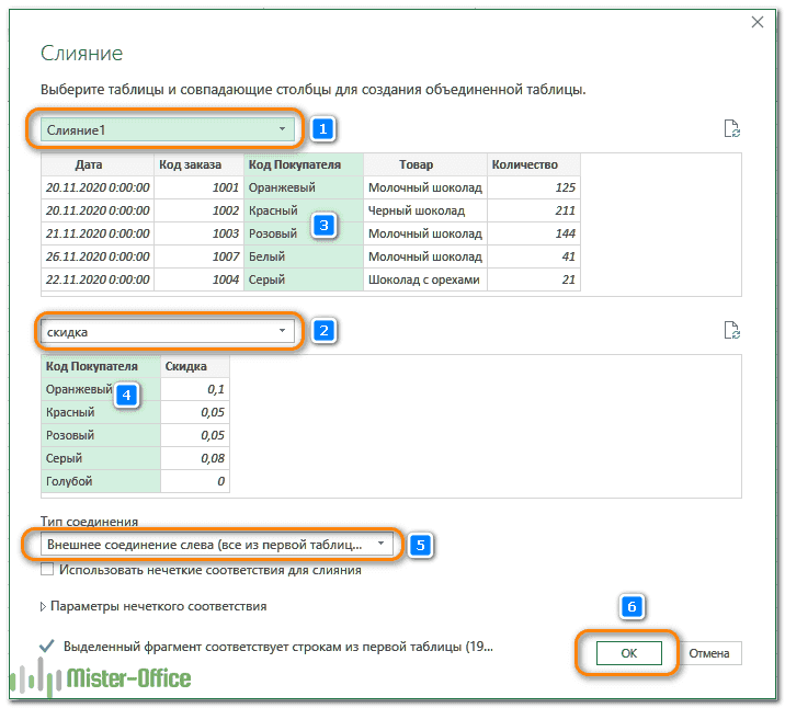 - Объедините Merge1 с вашей третьей таблицей (Discount), следуя уже известным нам шагам (вкладка «Данные» — «Получить данные» — «Объединить запросы).