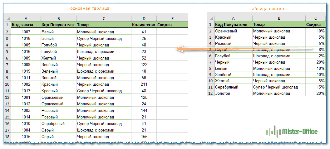 Итак, у нас в основной таблице есть список заказов для нескольких покупателей. И для этих покупателей на некоторые товары есть таблица скидок. Вы должны перенести процент скидки в основную таблицу. Обратите внимание, что в основной таблице больше строк, чем в таблице поиска: