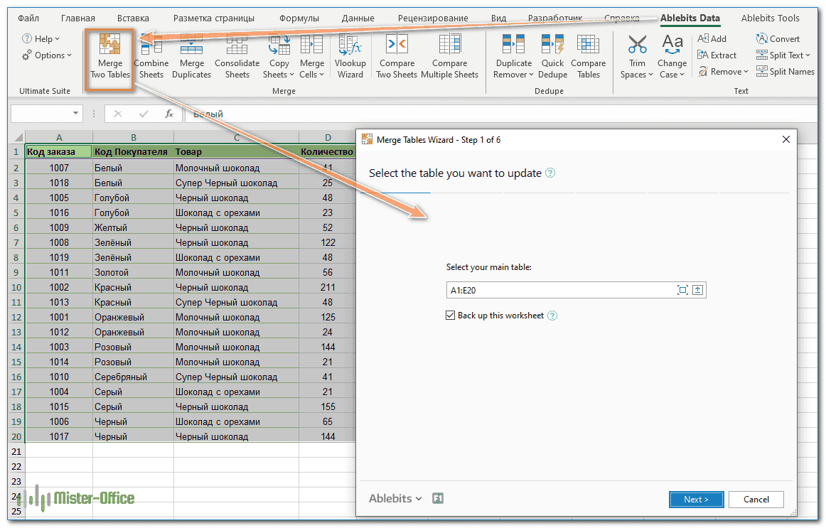 - Выберите любую ячейку в основной таблице и нажмите кнопку «Объединить две таблицы» на вкладке «Данные Ablebits»: