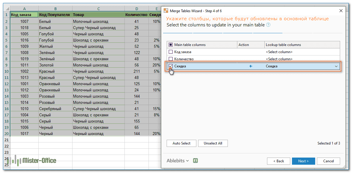 Шаг 4: Выберите столбец «Скидка» для обновления. То есть обновленные значения соответствующего столбца таблицы поиска будут переданы в этот столбец основной таблицы. Параметры для этого дополнения вы укажете чуть позже.