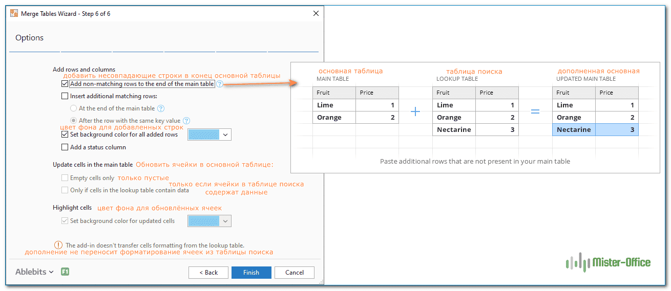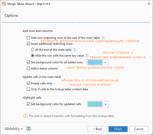 Шаг 6. Поскольку в столбце «Скидка» есть несколько пробелов, мы выбираем обновление только в том случае, если ячейки в таблице поиска содержат данные. Таким образом мы обновим устаревшие значения, но не потеряем данные, которые по какой-то причине исчезли из таблицы поиска. При желании вы можете выделить обновленные ячейки любым цветом по вашему выбору. На следующем снимке экрана показаны настройки: