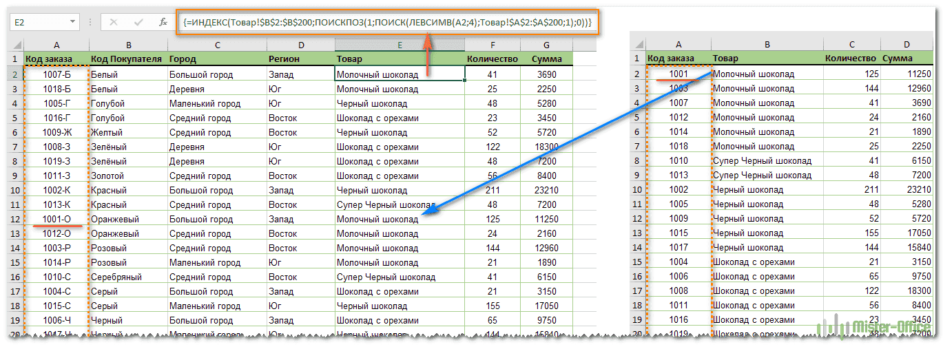 В случае примерного совпадения кодов заказов, которое мы рассматривали ранее, комбинация ИНДЕКС+ПОИСКПОЗ позволяет обойтись без вспомогательного столбца.