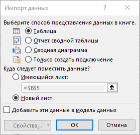 - В диалоговом окне «Импорт данных» выберите параметры «Таблица» и «Новый лист».