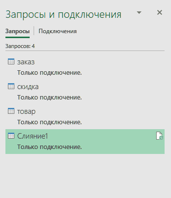 Теперь посмотрим, как можно объединить две таблицы в одну с помощью созданных подключений: