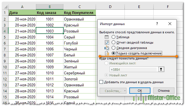 - В диалоговом окне «Импорт данных» выберите параметр «Только создать соединение» и нажмите «ОК» .