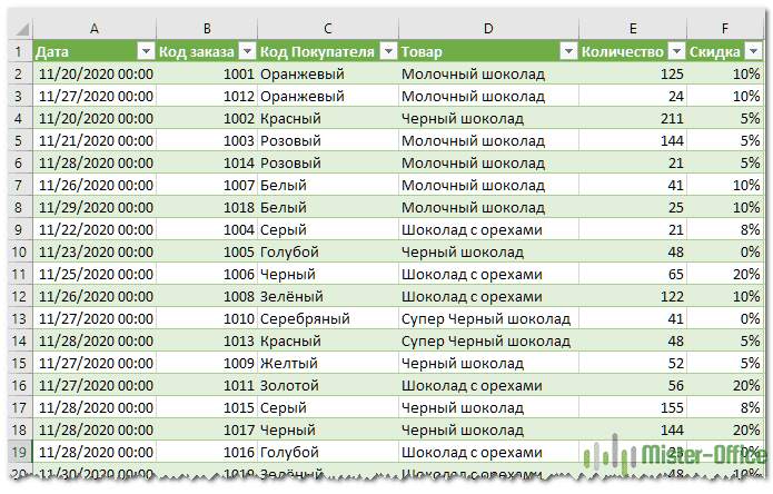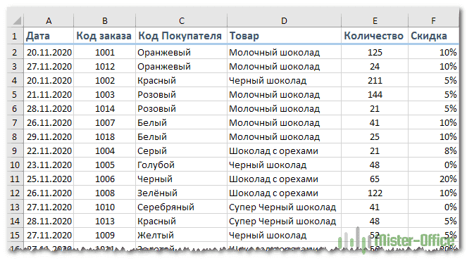 Здесь вы можете увидеть файл записей о продажах. Из него нам нужно извлечь только записи 4-х покупателей в основной таблице.