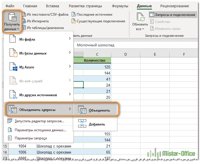 - На вкладке «Данные» нажмите кнопку «Получить данные», в раскрывающемся меню выберите «Объединить запросы» и нажмите «Объединить»: