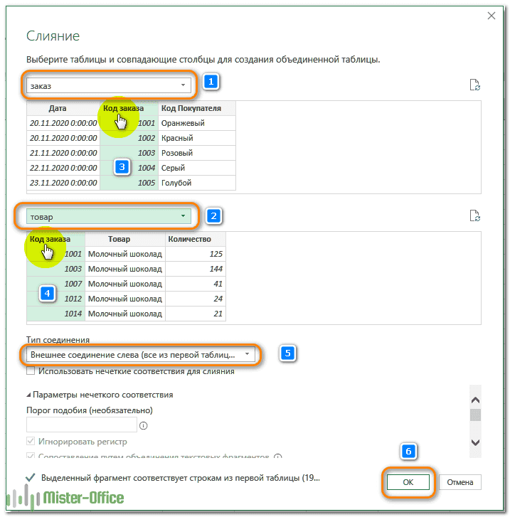 - В диалоговом окне «Объединение» выполните следующие действия: