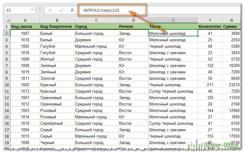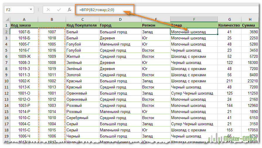 =ВПР(B2,продукт,3,0)