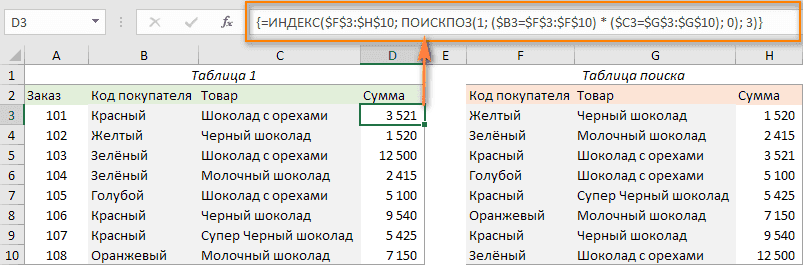 =ИНДЕКС($F$3:$H$10; ПОИСКПОЗ(1; ($B3=$F$3:$F$10) * ($C3=$G$3:$G$10); 0); 3)