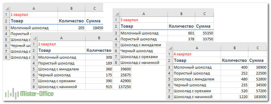 Начнем с самого простого примера, когда вам нужно объединить данные из нескольких таблиц путем их суммирования. Предположим, у нас есть данные о продажах за 4 квартала. Нам нужно найти их сумму.