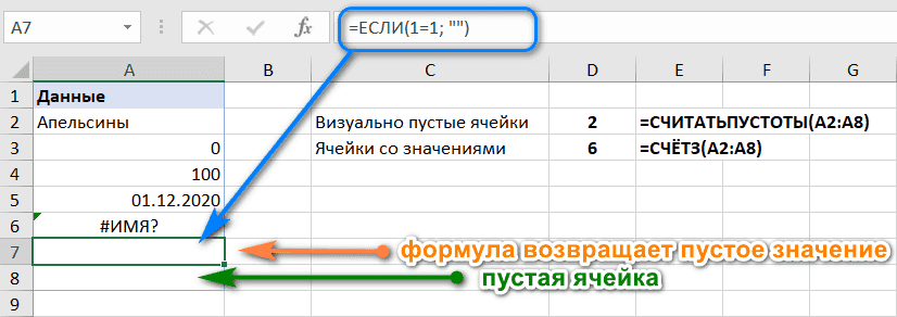 Глядя на рисунок выше, обратите внимание, что A7, содержащий формулу, возвращающую пустое значение, вычисляется иначе: