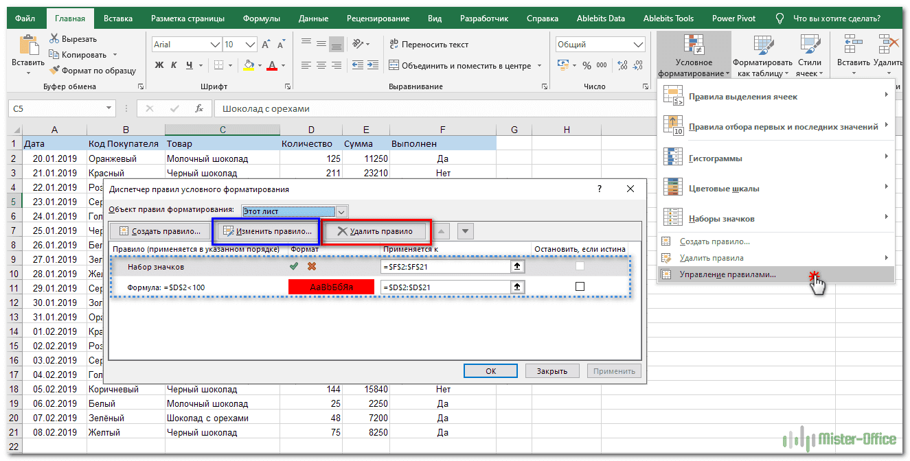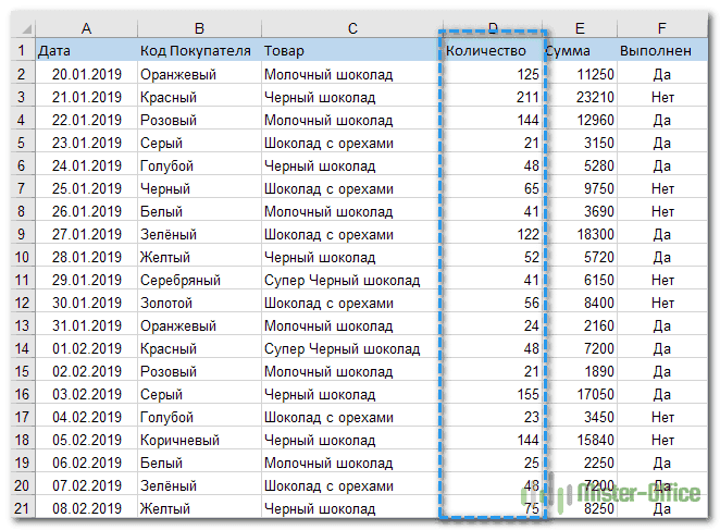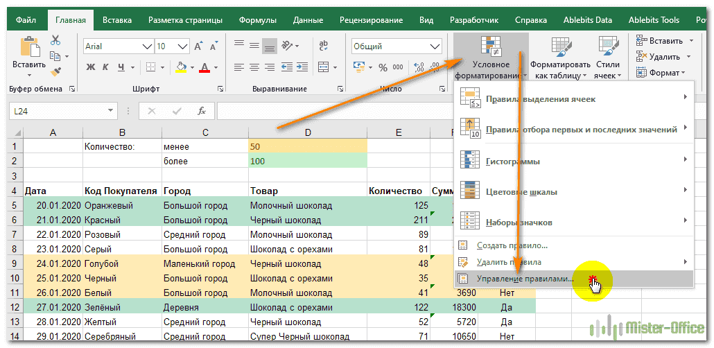 Решение: Предположим, у вас есть таблица, содержащая данные о продажах шоколада различным покупателям. Необходимо раскрасить ячейки с количеством в таблице Excel следующим образом: менее 100 единиц товара – красным, 100 и более – зеленым.