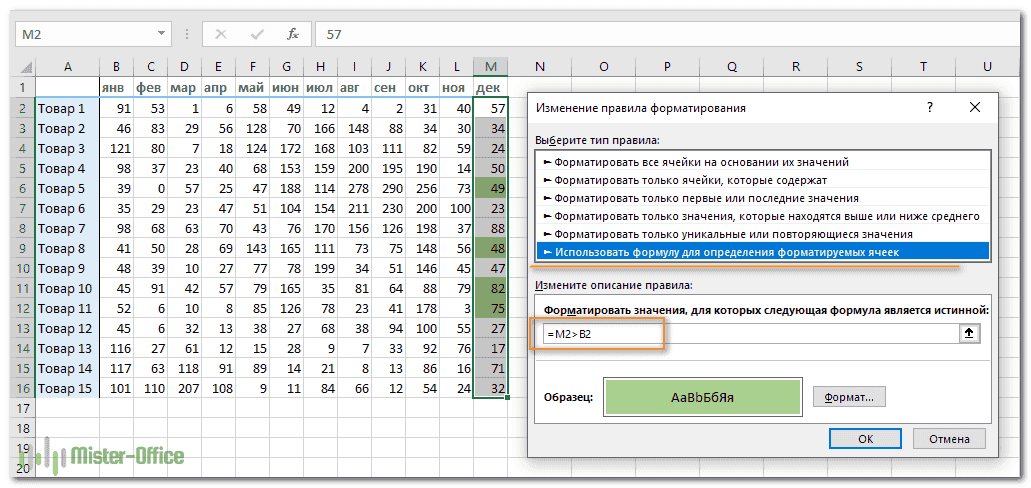 В двух приведенных выше примерах мы создали правила форматирования, напрямую указав числа: ограничения. Но в большинстве случаев вам нужно создать критерии форматирования на основе значений ячеек. Как это сделать? Предположим, в таблице записаны ежемесячные продажи различных продуктов. Необходимо выделить цветом те декабрьские числа, которые были больше, чем январские, в начале года.