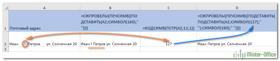 - В ячейке C3 вы заменяете СИМВОЛ(127) обычным пробелом (" "), а затем просто заменяете его: