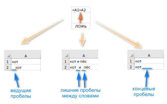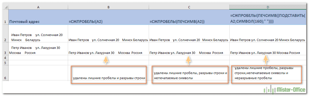 Если ваш рабочий лист содержит также непечатаемые символы, включает к описанному выше ещё функцию ПЕЧСИМВ, чтобы избавиться от одних пробелов и других ненужных знаков махом: