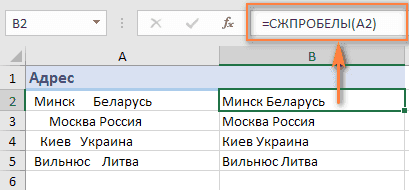 Теперь, когда вы знаете, сколько пробелов содержит ячейка, вы можете безопасно удалить лишнее, укажите функцию сжпробелы.