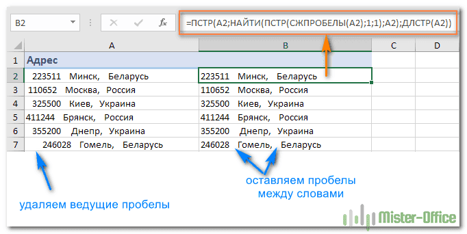 Если ваш набор данных содержит лишние пробелы, СЖПРОБЕЛЫ могут помочь вам удалить их все махом - назначить, конечные и несколько нескольких промежуточных промежуточных, установить только один интервал между простыми словами.