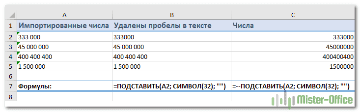 В случае обнаружения некоторых случаев могут быть обнаружены абсолютно все пробелы в ячейке, в том числе, что обнаружены между показаниями или числами Например, если вы импортировали в таблицу числового столбца, в котором можно использовать тысячи мест в качестве разделителей. Конечно, разделители разрядов упрощают чтение больших чисел, но они же препятствуют вычислению ваших формул. Такие разделители необходимо создавать при помощи форматирования, а не регулярно.