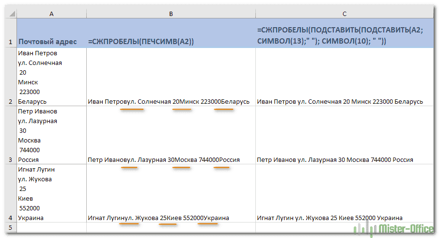 Здесь мы вместе с личными пробелами удалили еще и переводы строк, чтобы значения располагались в привычном виде, в одной строке.