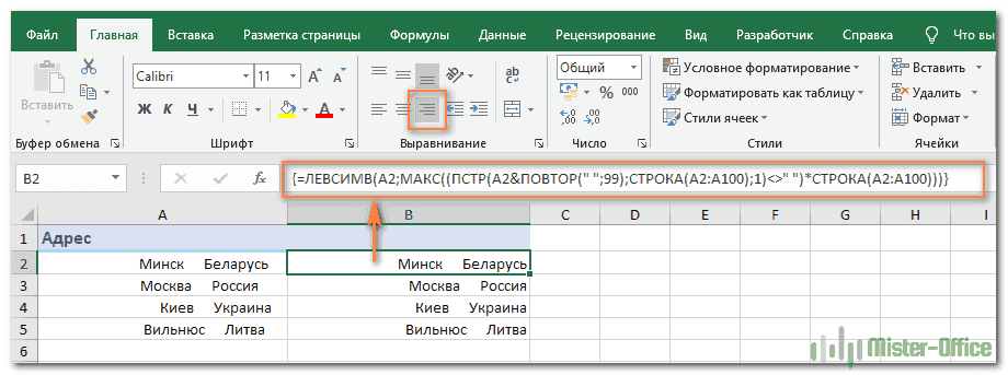 И обратите внимание на то, что ее нужно ввести как формулу массива (с помощью Ctrl+Shift+Enter). В столбце, чтобы выровнять по правому краю, получилось плохо из-за разного количества концевых пробелов в каждой ячейке. В столбце B эта проблема решена, и можно красиво закрыть текст.